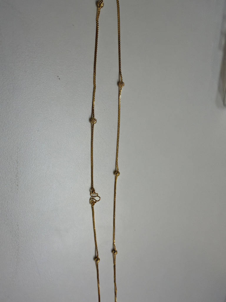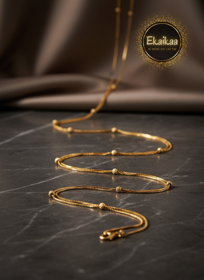 Adorn yourself with this exquisite gold G.Chain, featuring a delicate chain gracefully accented by shimmering, textured gold beads. Its versatile design offers a touch of timeless elegance, perfect for elevating any outfit whether worn solo or layered.