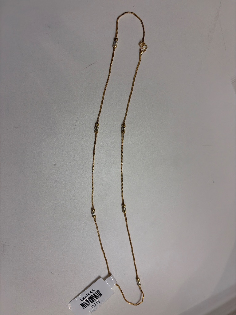 Adorn your neckline with this radiant gold chain, featuring finely spaced stations adorned with shimmering stones that catch the light beautifully. Its delicate design offers a sophisticated touch, perfect for adding a subtle sparkle to any look, whether worn solo or layered.