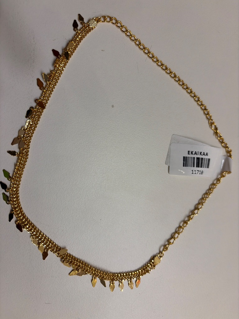 This elegant gold-toned necklace features a delicate chain adorned with an array of shimmering leaf-shaped charms. Its captivating design and subtle sparkle make it a versatile accessory, perfect for adding a touch of sophisticated charm to any outfit, from casual to formal.