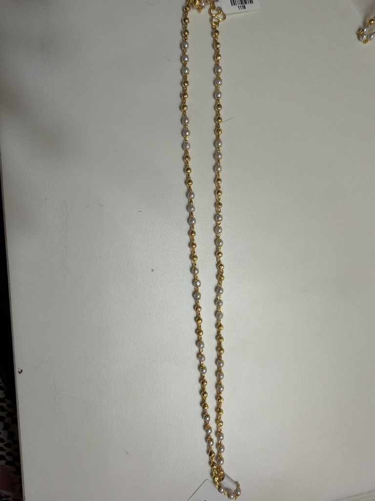 Adorn yourself with the timeless elegance of this exquisite pearl chain, a stunning blend of classic design and radiant charm. The delicate gold-toned chain is beautifully interspersed with lustrous white pearls, creating a sophisticated rhythm that catches the eye. Versatile and refined, it's the perfect accessory to elevate any outfit with a touch of enduring grace.