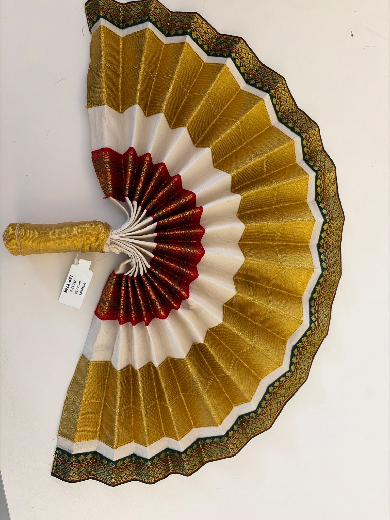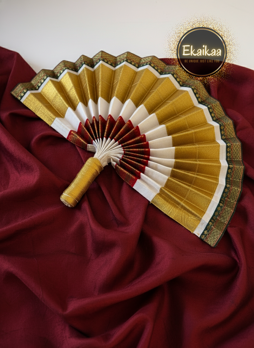 Discover the exquisite Udayada, a meticulously crafted fan radiating traditional elegance. Its luxurious pleated fabric in shimmering gold, pristine white, and deep maroon is accented with an intricate border, creating a captivating visual masterpiece. Perfect as a ceremonial accessory or a striking decorative piece, it embodies timeless grace and cultural artistry.